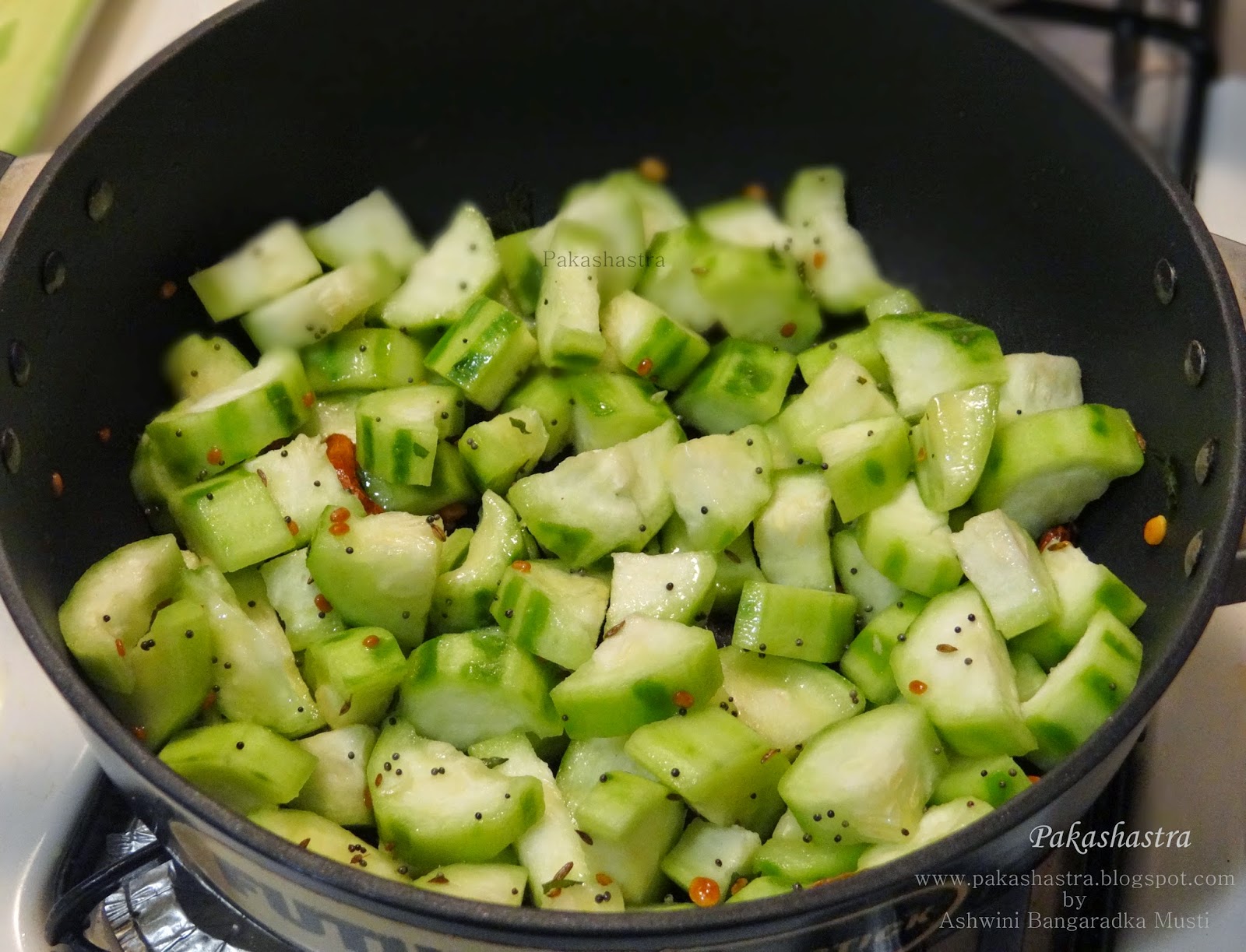 - When mustard seeds start spluttering, add cubed ridge gourd and sliced green chillis.