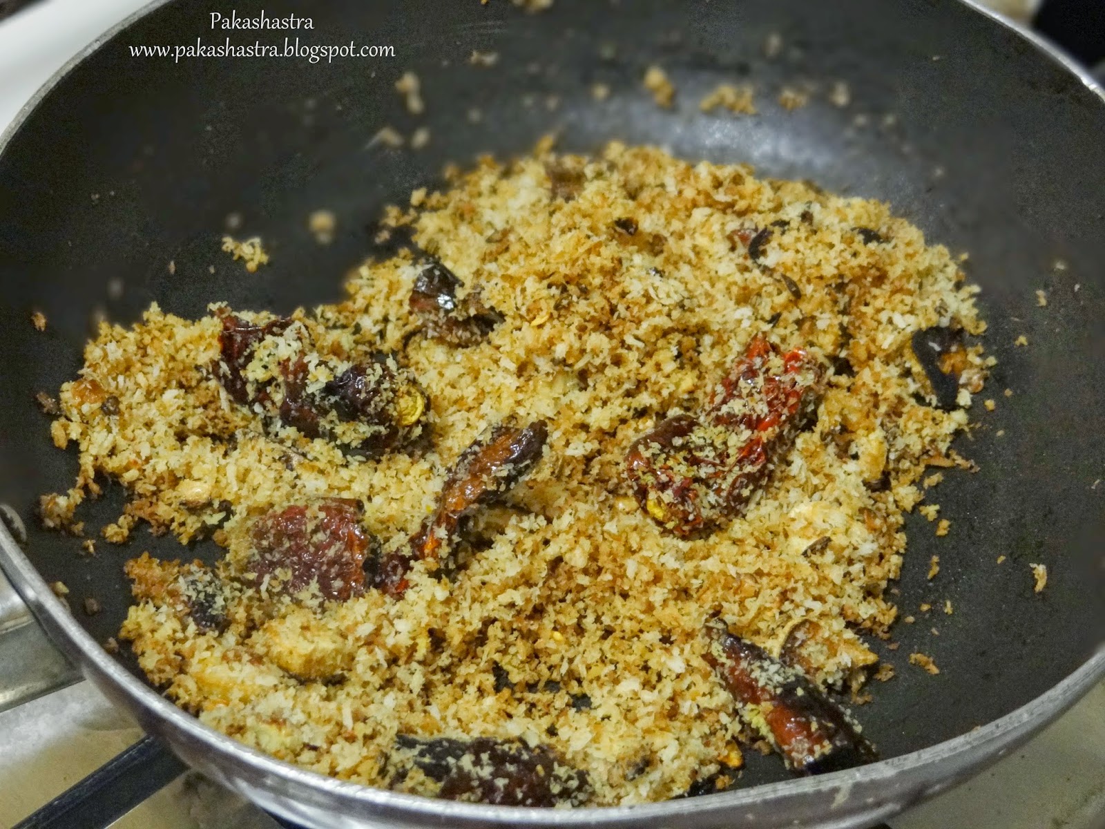 - Add cumin seeds and dry red chillis. Roast until chilli turn crisp.